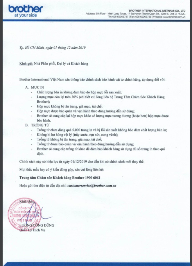 Chính sách bảo hành mực in hãng Brother